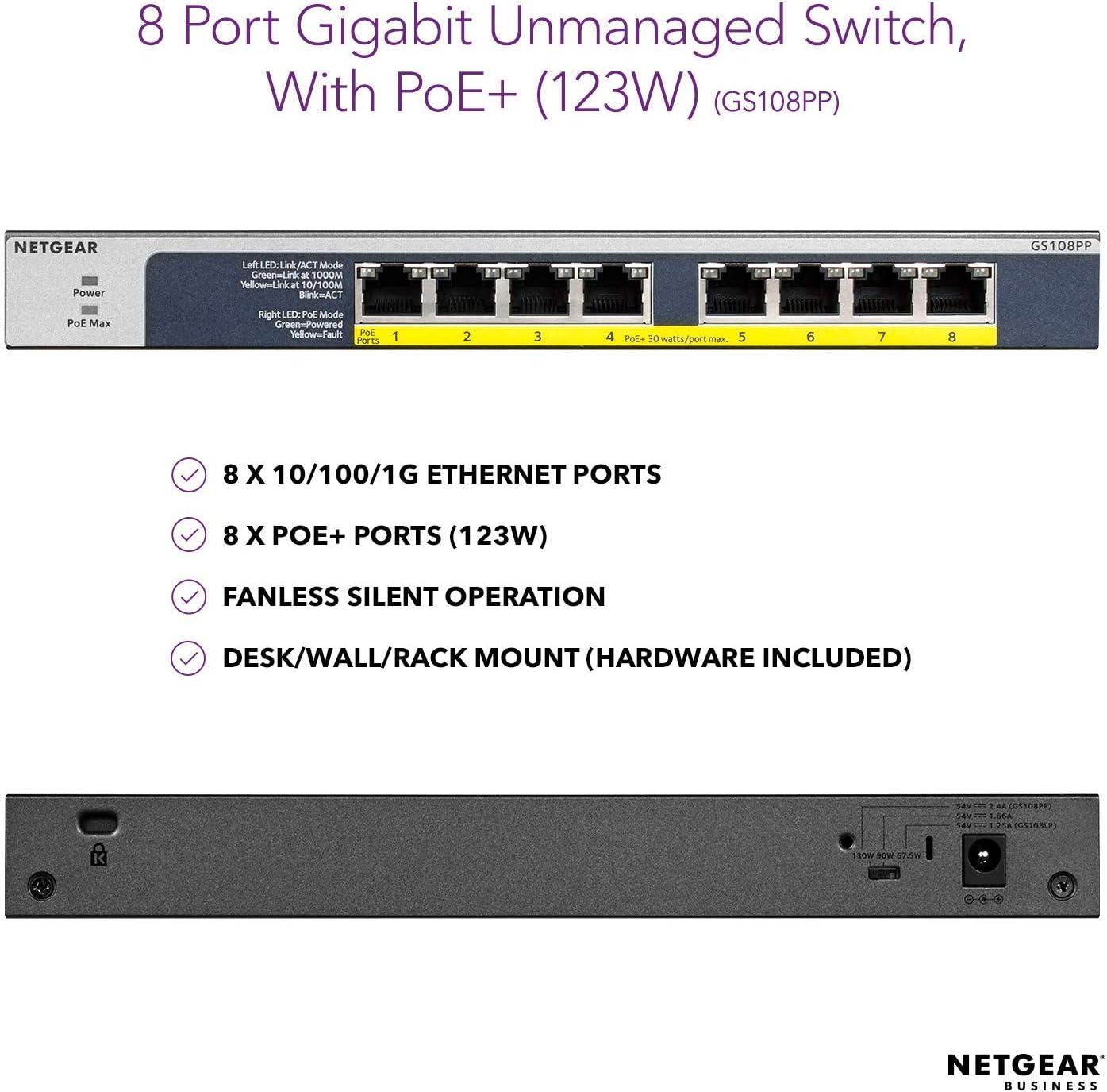 NETGEAR 16-Port Gigabit Ethernet Unmanaged PoE Switch (GS116PP) - with 16 x PoE+ @ 183W, Desktop/Rackmount, and ProSAFE Limited Lifetime Protection (Renewed)(8 port | 8xPoE+ 123W)