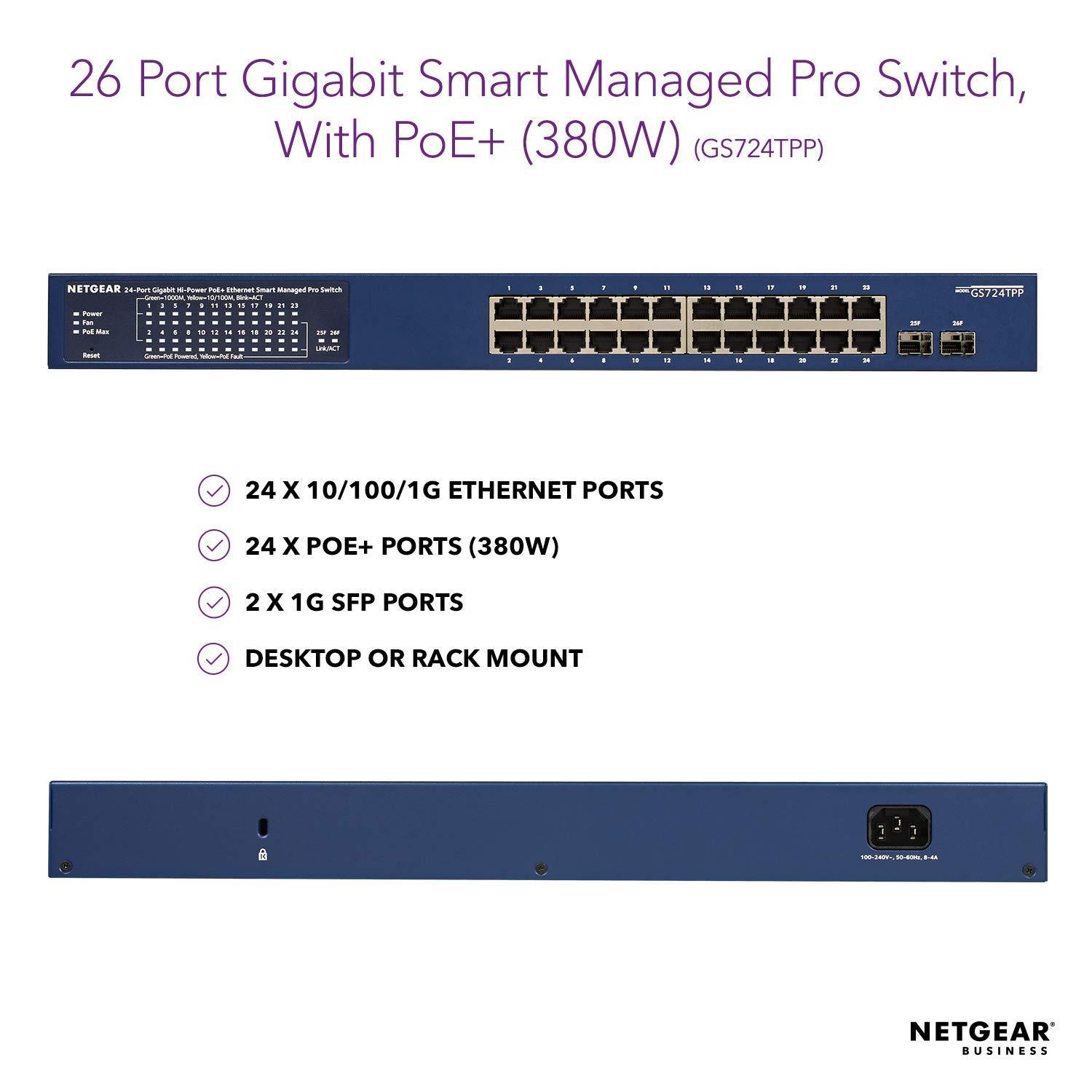NETGEAR 18-Port PoE Gigabit Ethernet Smart Switch (GS716TPP) - Managed with Insight Cloud Management, 16 x PoE+ @ 300W, 2 x 1G SFP, Desktop/Rackmount, and ProSAFE Lifetime Protection (Renewed)(26 port | 24xPoE+ 380W | 2xSFP)