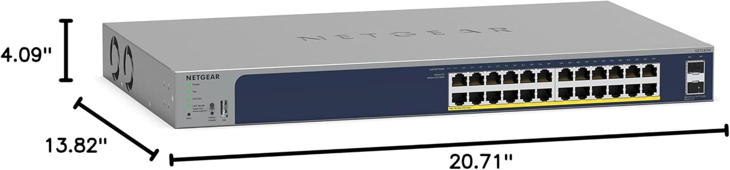 The NETGEAR GS724TPP 24-Port Gigabit Ethernet Smart Managed Pro PoE+ Switch with 2 Gigabit SFP ports is remote/cloud manageable and provides a total PoE budget of 380W for wireless networks IP surveillance and video-over-IP deployments