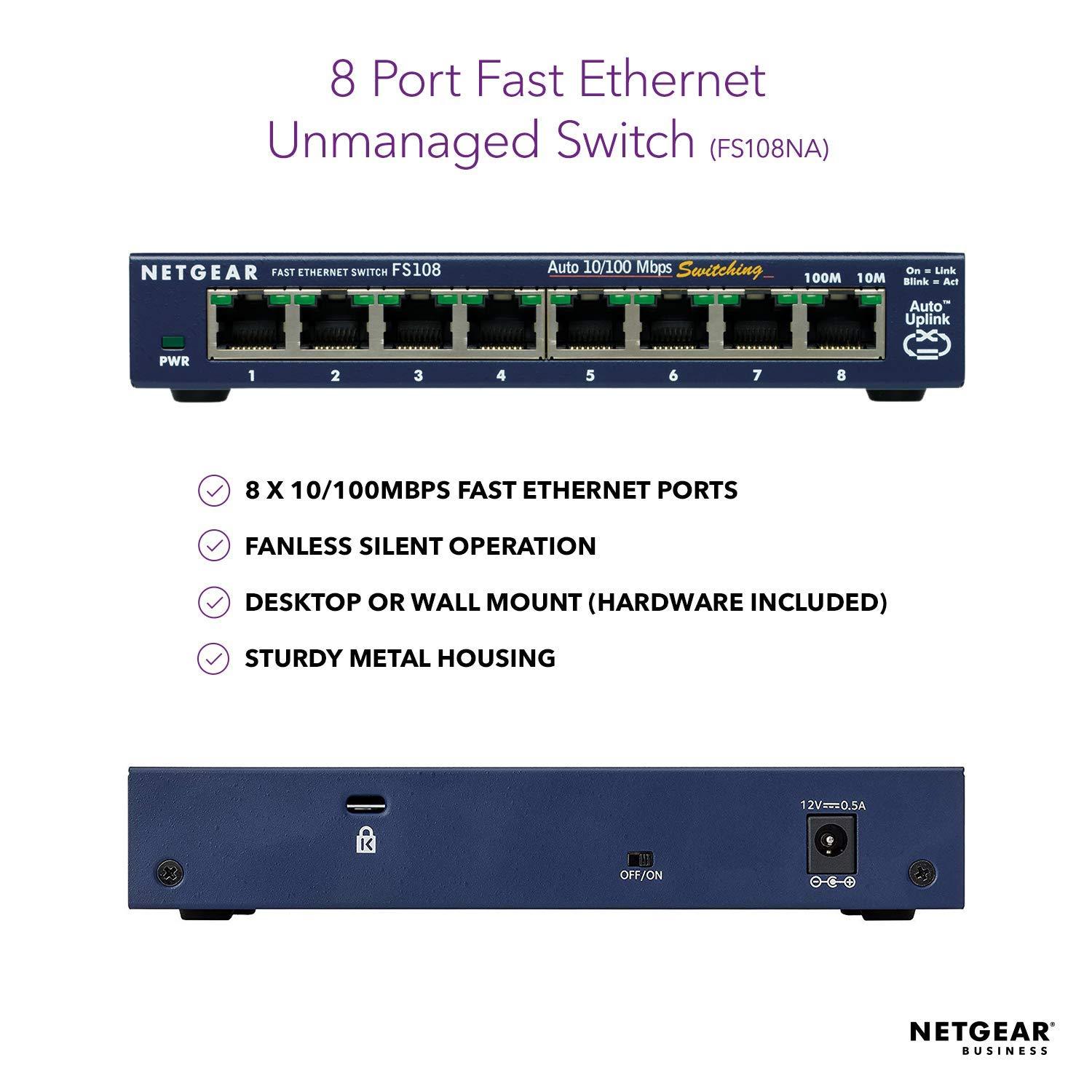 NETGEAR 5-Port Fast Ethernet 10/100 Unmanaged Switch (FS105) Desktop and ProSAFE Lifetime Protection, Blue(8 Port)