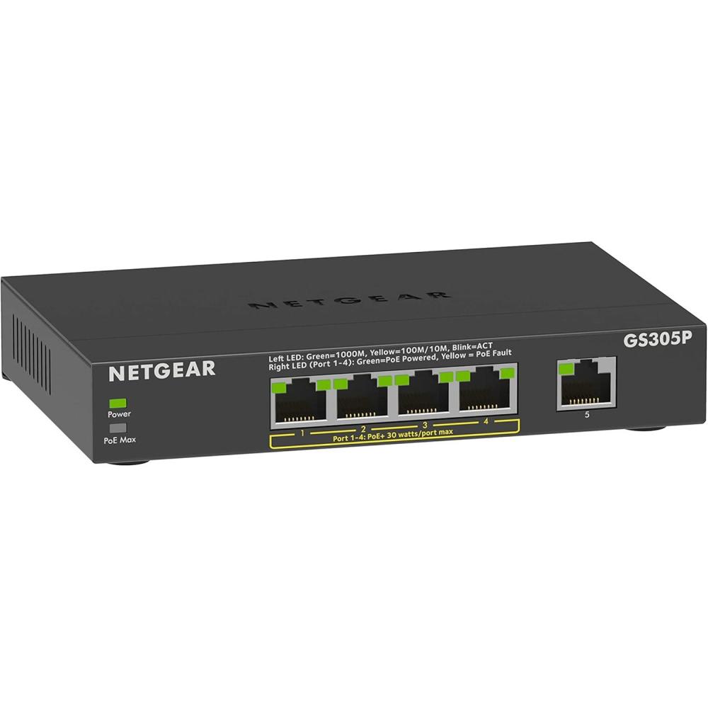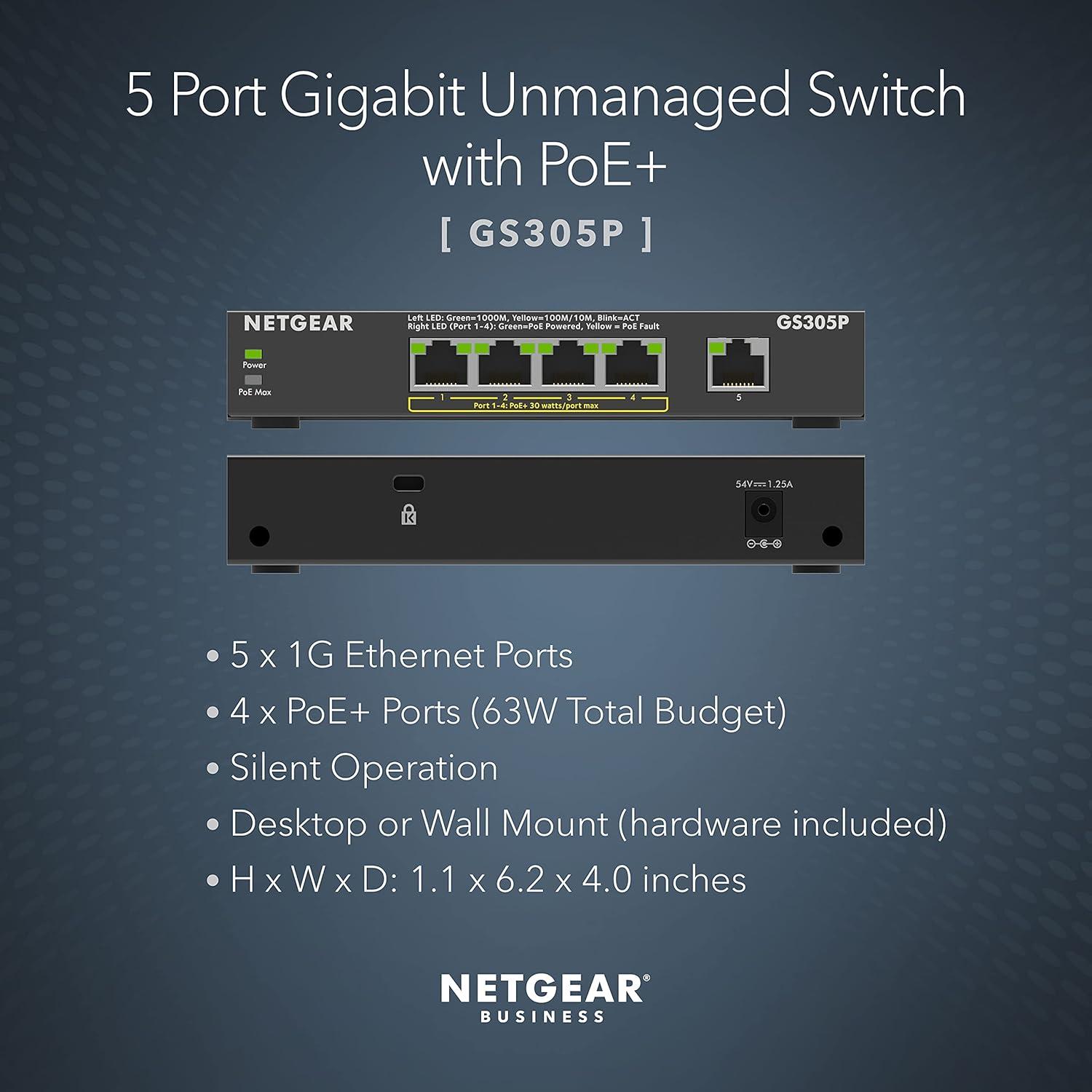 NETGEAR 5-Port Gigabit Ethernet Unmanaged PoE Switch (GS305P v2) - with 4 x PoE+ @ 63W, Desktop or Wall Mount