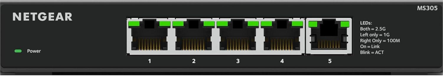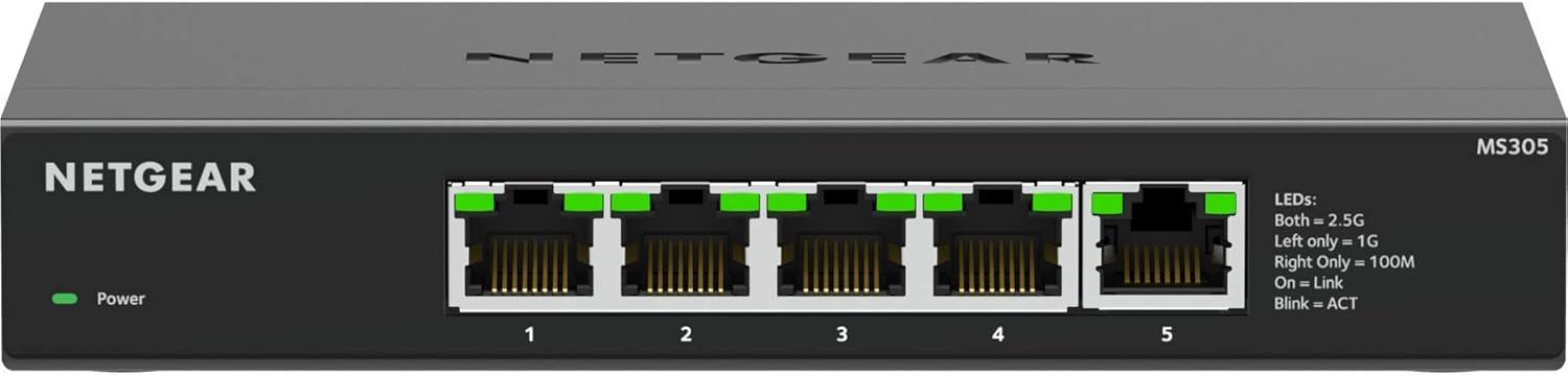 The NETGEAR 5-port Multi-Gigabit Unmanaged Switch helps businesses cost-effectively expand their network with Multi-Gigabit speeds. The MS305 Multi-Gigabit Ethernet Switch comes with 5 2.5G ports in a metal case and can be placed on a desk or wall-mountable. This switch is fanless, energyefficient, built to last, and rigorously tested to provide the reliability businesses need. MS305 features easy per-port monitoring with LEDs for port activity and speed, 802.1p traffic prioritization and jumbo frame support allow for seamless integration with more sophisticated networks. MS305 includes 3-year Limited hardware warranty and 24/7 chat with a NETGEAR expert.