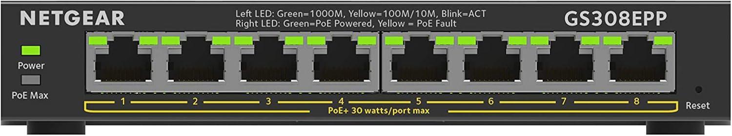 The NETGEAR GS308EPP Plus Network Switch offers 8 port Gigabit Ethernet, 8 PoE+ ports with a power budget of 123W, desktop or wall mount, 5 year limited hardware warranty and much more.