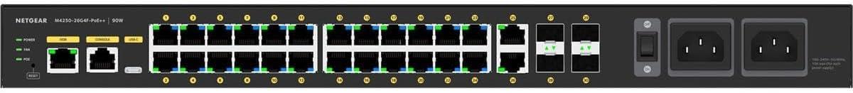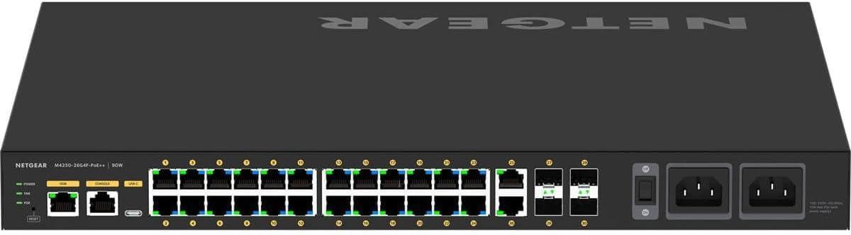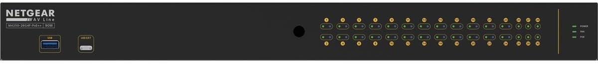 Netgear Switch M4250 26G4F POE++ MNGD – The M4250 series ranges from 8 to 48 ports with a variety of PoE, PoE+, and Ultra90 PoE++ options. Additionally, uplink options include 1G for standalone audio or video installations, as well as 10G uplinks for larger-scale video deployments. The M4250 series also includes 12-port multi-Gigabit Ethernet and 16-port 1G/10G fiber models for plug-and-play aggregation in a fully automated star topology.