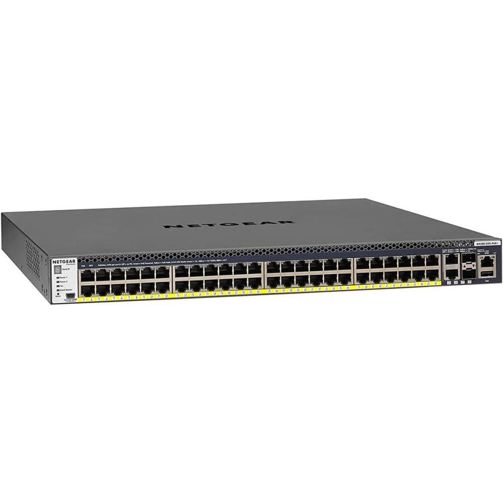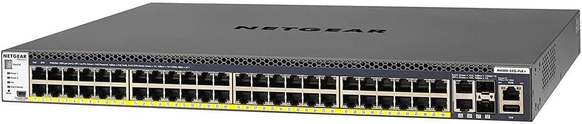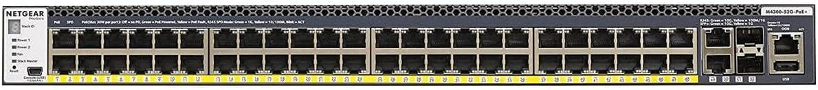 The M4300-52G-PoE+ provides 48 Gigabit PoE+ ports with 2 10GBASE-T and 2 10GBASE-X SFP+ uplinks all independent and 1G backward compatible