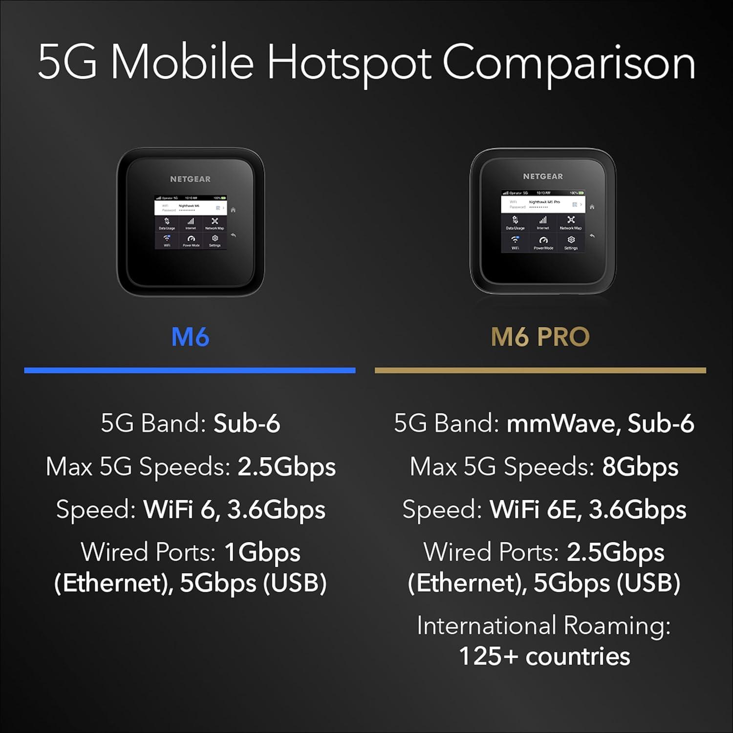 Experience blazing fast 5G internet with speeds up to 2.5Gbps at home or on the go. The NETGEAR® Nighthawk® M6 Mobile Router features In-Home Performance mode to boost WiFi coverage up to 2,000 sq. ft. at home or, for max coverage and speed, connect M6 to your router or mesh system and use as your primary internet connection for up to 32 devices. Get exceptional performance with fast 3.6Gbps WiFi 6 speeds and 1 Gig Ethernet port for a wired connection to a WiFi router, mesh system, laptop or other wired devices. Reliable and secure, the M6 provides WiFi service wherever you go. The simple-to-use 2.4” LCD touch screen lets you conveniently monitor data usage, see WiFi name/password, mobile signal strength, and manage device and network settings. Unlocked to work on 5G and 4G LTE and with all providers; certified with AT&T and T-Mobile.