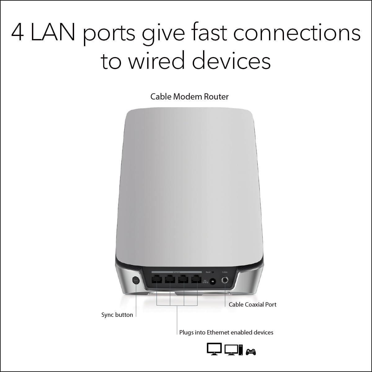 Integrated cable modem and WiFi 6 satellite provides high-performance WiFi coverage for up to 5,000 sq. ft. and 40 plus devices. Expand coverage by 2,500 sq. ft. with each optional Orbi Mesh WiFi 6 satellite (sold separately)
