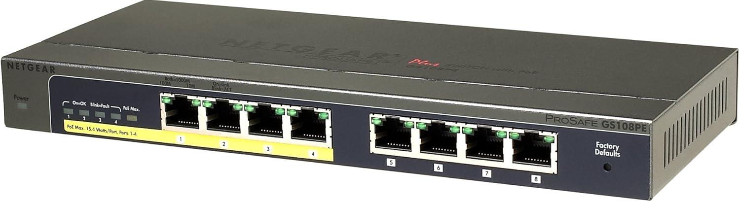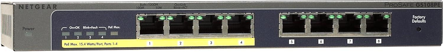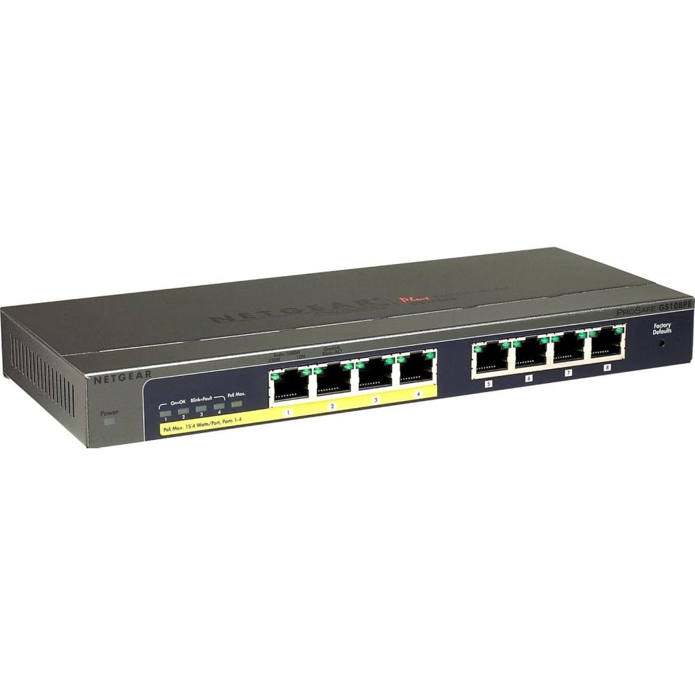 The NETGEAR ProSAFE GS108PE 8-port Gigabit PoE Web Managed (Plus) Switch w/ 4-port PoE provides fundamental network features that will help optimize the performance of business networks. On top of the plug-N-play Gigabit Ethernet connectivity, the GS108PE also offers essential networking features such as VLAN, QoS, IGMP Snooping, Link Aggregation (LAG), rate limiting and traffic monitoring. 4 of the ports are PoE ports with a total power budget of 45W and can power devices such as IP phones, IP surveillance cameras and wireless access points with just an Ethernet cable. NETGEAR ProSAFE Web Plus Switches are an exceptional value for businesses looking to add intelligence to their network beyond what unmanaged switches can provide.