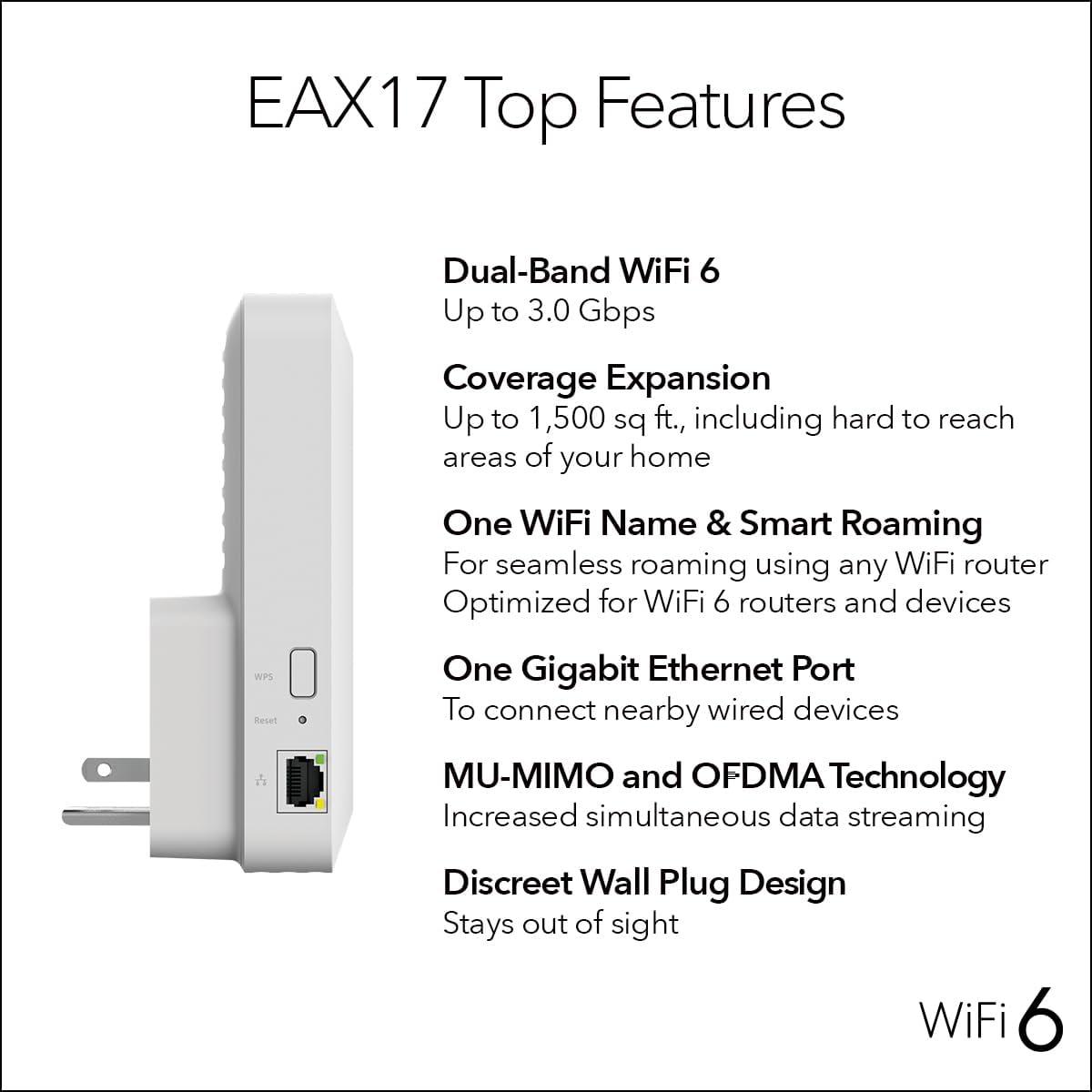 The NETGEAR 4-Stream WiFi 6 Mesh Extender (EAX15) is built for the future of WiFi to create a powerful mesh WiFi network for increased coverage in your home. Experience the power of the latest generation WiFi 6 (802.11ax) for dramatically faster WiFi to your smartphones, tablets, computers, and so many more devices. The convenient wall-plug design provides more capacity plus backwards compatibility with your current and previous generation routers and devices (WiFi 5, WiFi 4, and earlier generation WiFi standards) means that you’ll enjoy ultra-fast WiFi in the farthest corners of your home today and for all your future tech purchases for years to come. Operating temperature 32 to 140 degrees F.